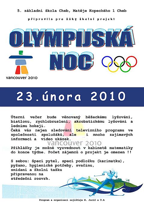 18 úno,2010 Akce školy Václav Uhlík Zobrazeno 4298 × Olympijská noc Na úterý 23.2. připravila škola projekt Olympijská noc na 5. ZŠ. Leták najdete v článku. Předchozí článek: Akce na měsíc březen Předchozí článek Další článek: Lyžařský a snowboardový výcvik 2010 Následující článek