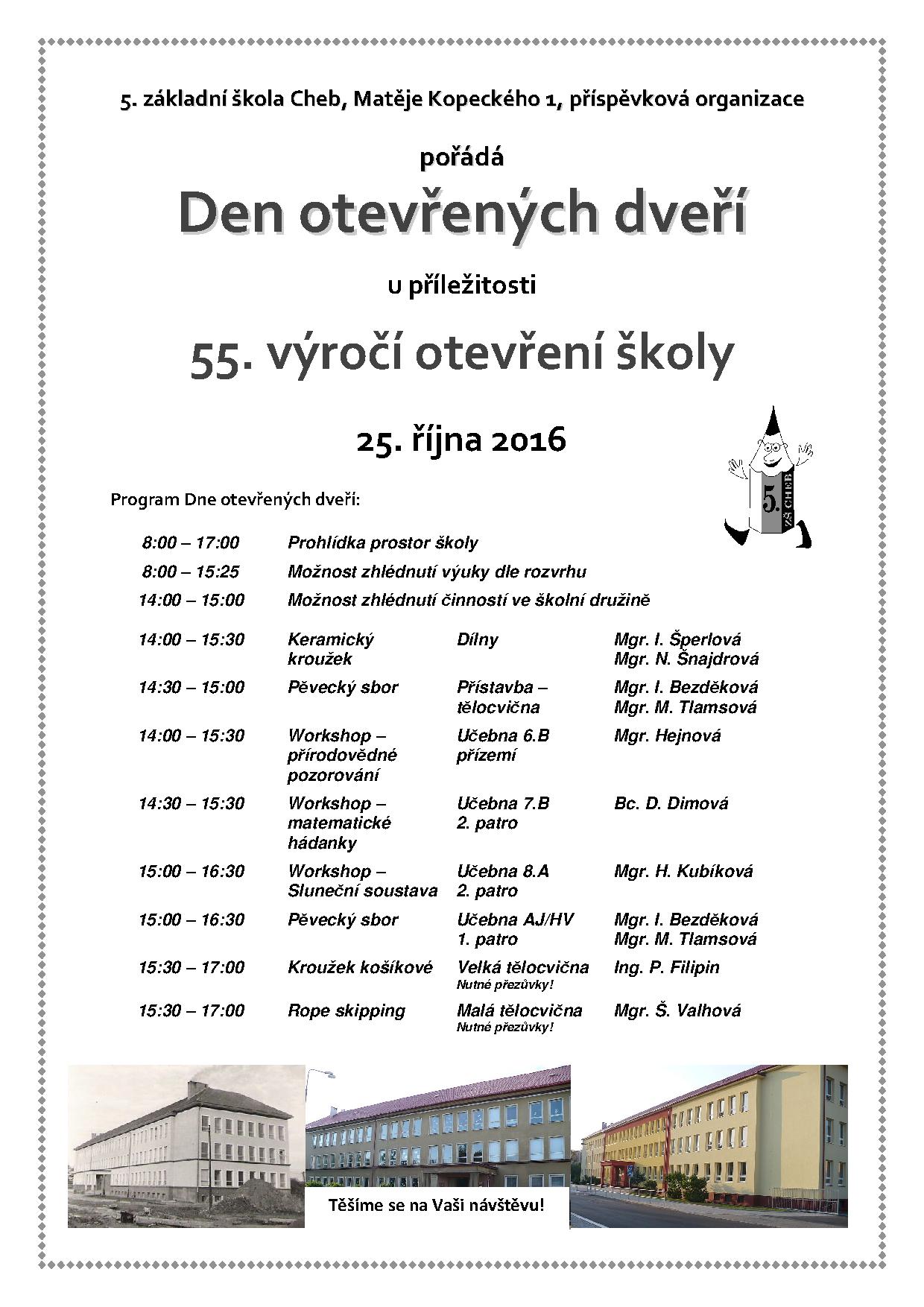 5. základní škola Cheb pořádá dne 25.10.2016 u příležitosti 55. výročí otevření školy Den otevřených dveří. Program najdete v článku.