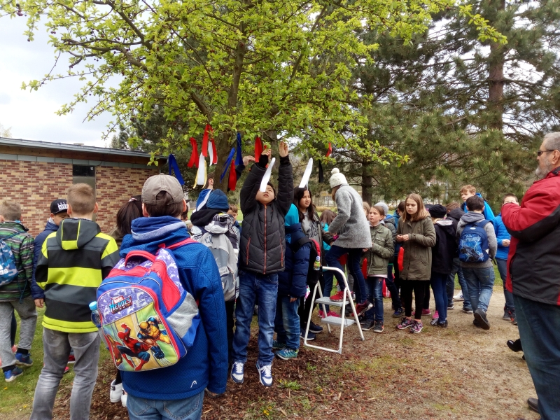 Na závěr oficiálního představování zazpívali všichni přítomní žáci píseň Přátelství. Pak se partnerské školy přemístily ke svým stromům. Ty společně vyzdobily stuhami v barvách vlajek obou států a strom opatřily cedulkou s označením obou škol.
