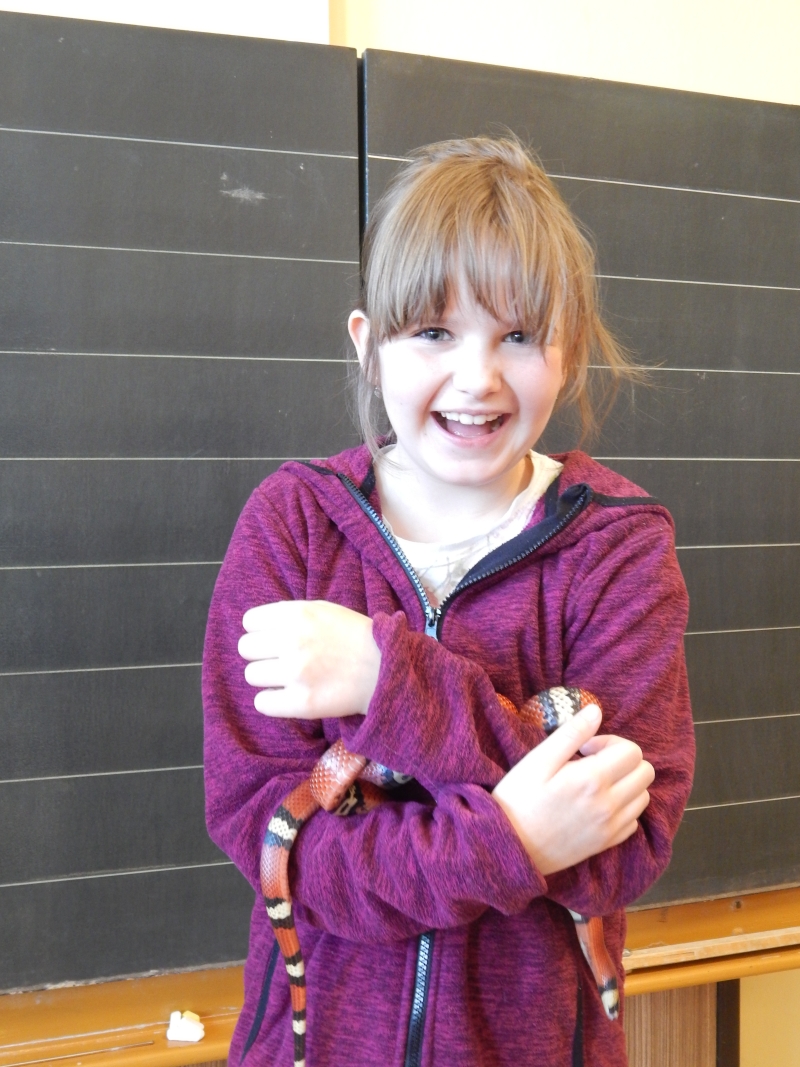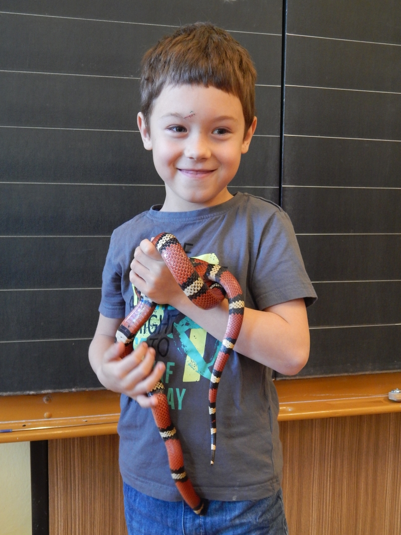 Všechny děti celou hodinu prvouky napjatě poslouchaly a pokud je něco zajímalo, nebály se zeptat. Na závěr ti nejodvážnější zapózovali s hadem v ruce.