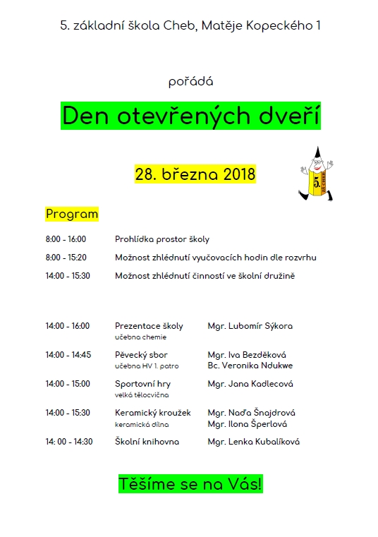22 bře,2018 Akce školy Václav Uhlík Zobrazeno 2573 × Den otevřených dveří 2018 5. základní škola Cheb pořádá dne 28.3.2018 Den otevřených dveří. Program najdete v článku. Předchozí článek: Beseda o energetice Předchozí článek Další článek: Zpívání k MDŽ v Domě pro seniory Následující článek
