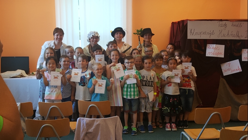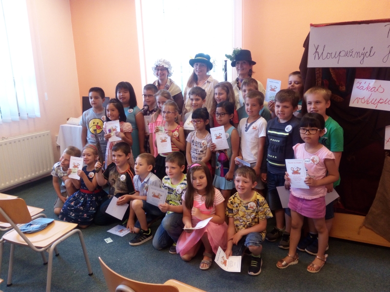 Čekalo tam na ně milé překvapení v podobě divadelního představení o Dvou Hloupežnicích. Všechny přítomné hra rozesmála. Ale nejen to. Plynulo z ní důležité ponaučení – „Je velmi důležité umět číst!“ Že si děti už s předstihem vzaly tuto radu k srdci, se brzy ukázalo. Jejich úkolem bylo totiž přečíst větu. Až po správné četbě věty mohly být pasovány na čtenáře. Za podpory mnohých rodičů se děti úkolu zhostily bravurně. Všechny byly úspěšně pasovány na Čtenáře knihovny. Někteří rodiče využili možnost předplatného zdarma pro prvňáčky a děti dostaly i průkazky do knihovny.