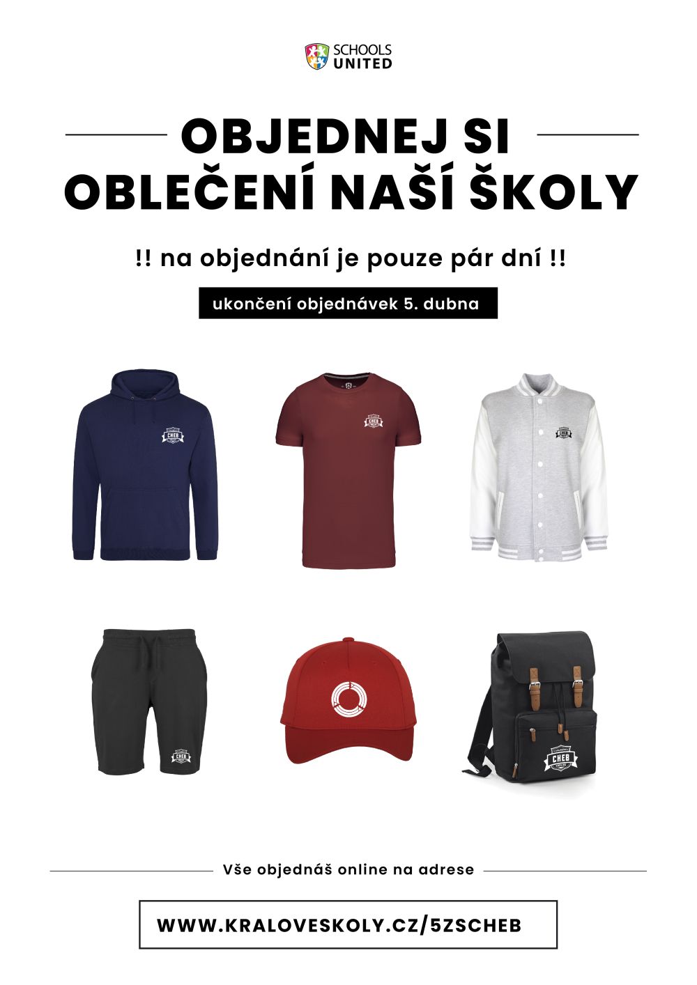 Nechali jsme si jako škola vytvořit svoji vlastní volnočasovou školní kolekci oblečení, kterou je možné si aktuálně pořídit na eshopu zde: https://www.kraloveskoly.cz/5zscheb/