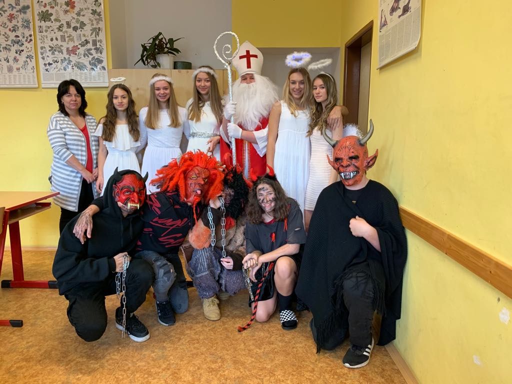 Tradiční mikulášská nadílka se nevyhnula ani naší škole, a tak někteří žáci a žákyně na 1. stupni byli navštíveni Mikulášem v biskupském oděvu s dlouhým bílým vousem a skupinou andělů a čertů.
