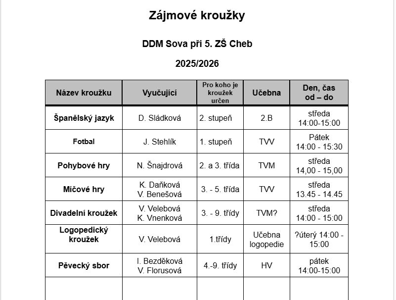 Nabídku zájmových kroužků pro školní rok 2024/2025 najdete v článku. Přihlašování na kroužky probíhá u vedoucích kroužků do konce září.